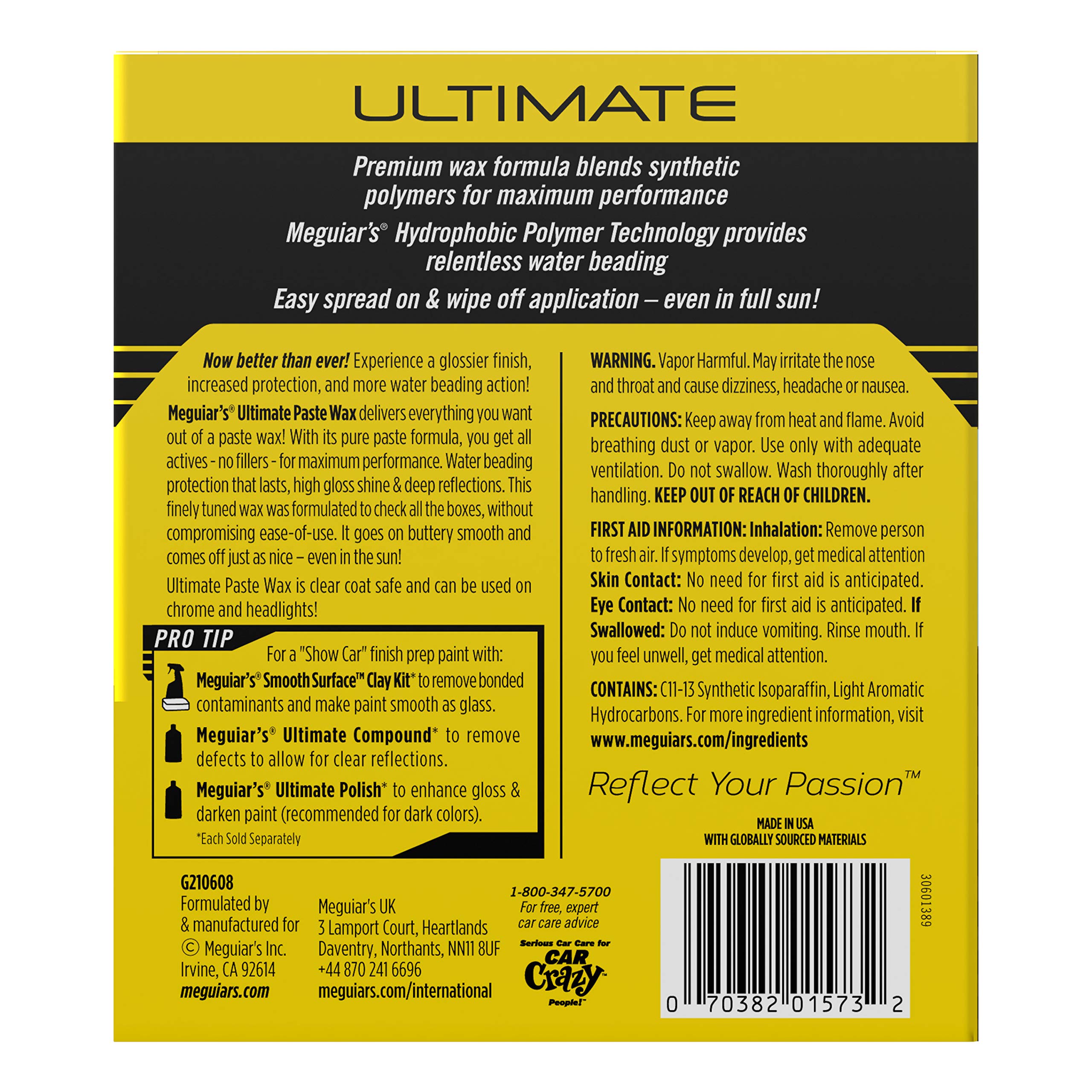 Meguiar's Ultimate Paste Wax, Premium Car Wax for a Deep Gloss with Lasting Protection, Easy to Apply and Remove, Clear Coat Safe, Microfiber Towel and Applicator Included, 8 Oz Paste